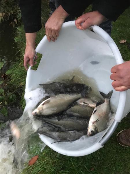 Vrijdag 13 november is er 250 kg giebel en 160 kg jonge brasem uitgezet in onze visvijver. Hopelijk worden ze goed gevangen!